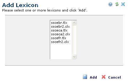 Use the Add Lexicon dialog to include new lexicon files in lexicon sets. Access this dialog by selecting Manage Lexicon Set from the Authoring Tools left panel of the Site Administration Dashboard and selecting Add New Lexicon Set.