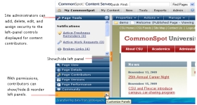 Authenticated administrators can further customize the workspace to show/hide add, delete, edit, and assign security to left-panel options through the CommonSpot Site Administration interface.