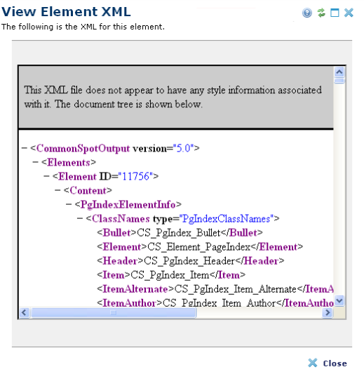 The View Element XML dialog is available for most all CommonSpot elements, including custom elements. The dialog displays the content of the current element in XML within a scrollable region.